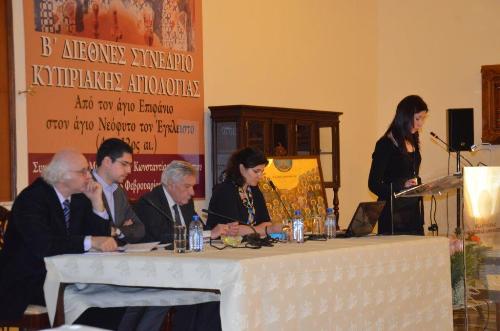 Από τις 16.00 μέχρι τις 18.00 έλαβε χώρα η Β΄ Συνεδρία του Αγιολογικού Συνεδρίου με γενικό θέμα: «Κύπριοι Άγιοι και συγγραφείς αγιολογικών έργων, 4ος με 7οςαιώνας». Η πρώτη εισήγηση ήταν από την κ. Αντωνία Γιαννούλη με θέμα: «Ελάσσονες Άγιοι της Κύπρου (4ος – 6ος αι.) και η ανέκδοτη υμνογραφία. Η κ. Γιαννούλη είναι Επίκουρος Καθηγήτρια στο Τμήμα Βυζαντινών και Νεοελληνικών Σπουδών της Φιλοσοφικής Σχολής του Πανεπιστημίου Κύπρου. Η Κύπρος είναι γνωστή και ως «Νήσος των Αγίων». Φυσικά δεν υπάρχουν μεγάλοι και μικροί Άγιοι. Ωστόσο είναι κάποιοι που τιμούνται περισσότερο και είναι πιο γνωστοί. Η εισήγηση της κ. Γιαννούλη αναφερόταν λοιπόν σε Αγίους της Κύπρου που δεν είναι τόσο γνωστοί. Στη συνέχεια ο Λέκτορας στο Τμήμα Ιστορίας του Royal Holloway του Πανεπιστημίου του Λονδίνου κ. Χαράλαμπος Δενδρινός και ο Διδακτορικός φοιτητής Χρυσοβαλάντης Κυριάκου ανέπτυξαν στην εισήγησή τους το θέμα: «The Encomium on St Barnabas by Alexander the Monk: ecclesiastical and imperial politics in sixth-century Byzantium».