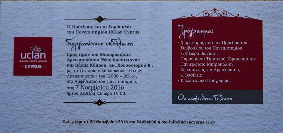 Από την πλευρά του ο Πρόεδρος του Συμβουλίου του Πανεπιστημίου UCLan Cyprus Φλώρος Βονιάτης ανέφερε ότι ο Μακαριότατος «απέδειξε μέσα στο σύντομο χρόνο της δεκαετούς αρχιεπισκοπίας του ότι είναι άνθρωπος των έργων και των καινοτομιών. Θεωρούμε το έργο του Αρχιεπισκόπου ιδιαίτερα σημαντικό και επωφελές για την κοινωνία και τον τόπο μας».