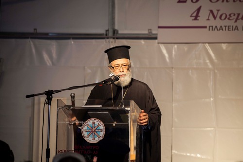Ακολούθησε η εκδήλωση, η οποία άρχισε με χαιρετισμό από τον Πανιερώτατο Μητροπολίτη Κωνσταντίας κ. Βασίλειο. Στο χαιρετισμό του ο Πανιερώτατος, καλωσόρισε και ευχαρίστησε για την παρουσία του τον Πρόεδρο της Βουλής. Εξέφρασε επίσης την ευαρέσκεια του για την διοργάνωση της «2ης Διεθνούς Έκθεσης Βιβλίου Κύπρου». Ο Πανιερώτατος στο χαιρετισμό του τόνισε μεταξύ άλλων ότι χιλιάδες ήταν οι Κύπριοι εθελοντές που κατατάγηκαν τότε στον Αγγλικό στρατό, αφού η Κύπρος ήταν τα χρόνια εκείνα Βρετανική αποικία. Σε αναλογία πληθυσμού η Κύπρος πρόσφερε ίσως περισσότερα σε ανθρώπινο δυναμικό στον αγώνα εναντίον των δυνάμεων του Άξονα από κάθε άλλη χώρα. Ολόκληρος ο Χαιρετισμός του Πανιερωτάτου παρατίθεται πιο κάτω.