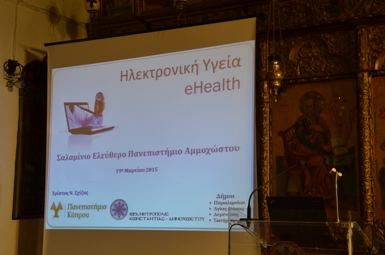 Πραγματοποιήθηκε την Πέμπτη 19 Μαρτίου 2015 η έκτη κατά σειρά διάλεξη του Σαλαμίνιου Ελεύθερου Πανεπιστημίου Αμμοχώστου στον παλαιό ναό του Αγίου Γεωργίου στο Παραλίμνι, φιλοξενώντας τον κ. Χρίστο Ν. Σχίζα, Καθηγητή στο Τμήμα Πληροφορικής του Πανεπιστημίου Κύπρου, ο οποίος μίλησε με θέμα Ηλεκτρονική Υγεία.