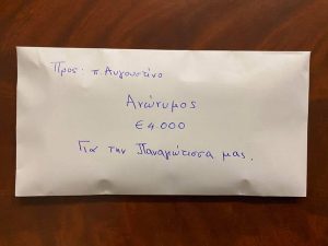 Ακόμα μια ευγενής και πολύ συγκινητική πράξη μας ανέμενε σήμερα στη Μητρόπολη Αμμοχώστου. Στο γραφείο του Πρωτοσυγκέλλου παραδόθηκε ένας ανώνυμος φάκελος που έγραφε τα εξής: Προς:π.Αυγουστίνο, Ανώνυμος, €4000, Για την Παναγιώτισσά μας! Το ποσό θα κατατεθεί στο ταμείο της Παναγιώτισσας για την αποπεράτωση των έργων. Είναι άξιες επαίνου τέτοιες πράξεις ανθρώπων που θέλουν να μένουν αφανείς. Ουσιαστικά είναι η πιστή τήρηση του ευαγγελίου: «μη γνώτω η αριστερά σου τι ποιεί η δεξιά σου». Να γνωρίζει δηλαδή μόνον ο Θεός! Εκφράζουμε τις βαθύτατες ευχαριστίες μας στον άνθρωπο αυτό και ευχόμαστε η Παναγία μας η Παναγιώτισσα και ο άγιος ιερομάρτυς Ζαχαρίας να τον ευλογούν και να του το ανταποδίδουν εκατονταπλασίονα!