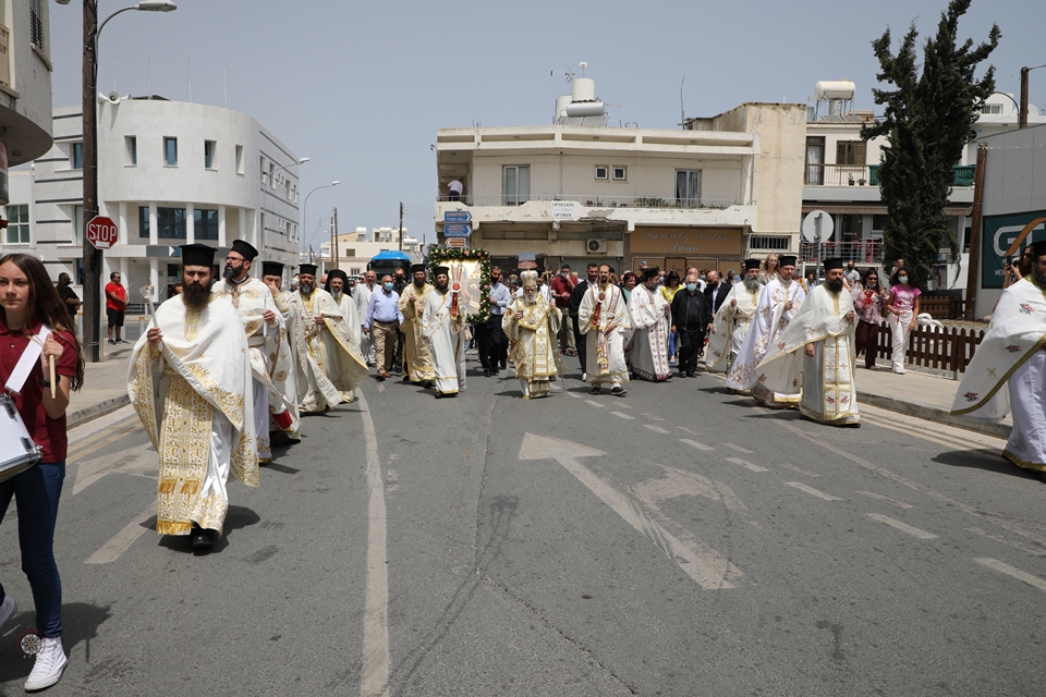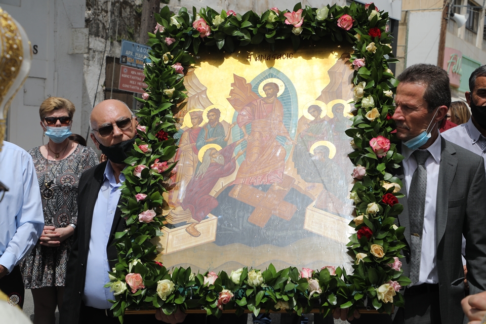 Ακολούθησε λιτανεία μέσα από τους κεντρικούς δρόμους της πόλης με την συνοδεία της μπάντας του Κατηχητικού Αγίου Γεωργίου και δέηση στους παλαιούς ναούς της Αγίας Άννας και του Αγίου Γεωργίου.