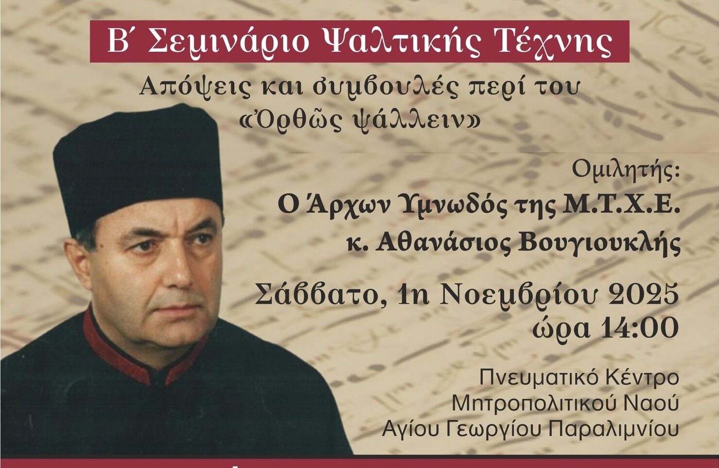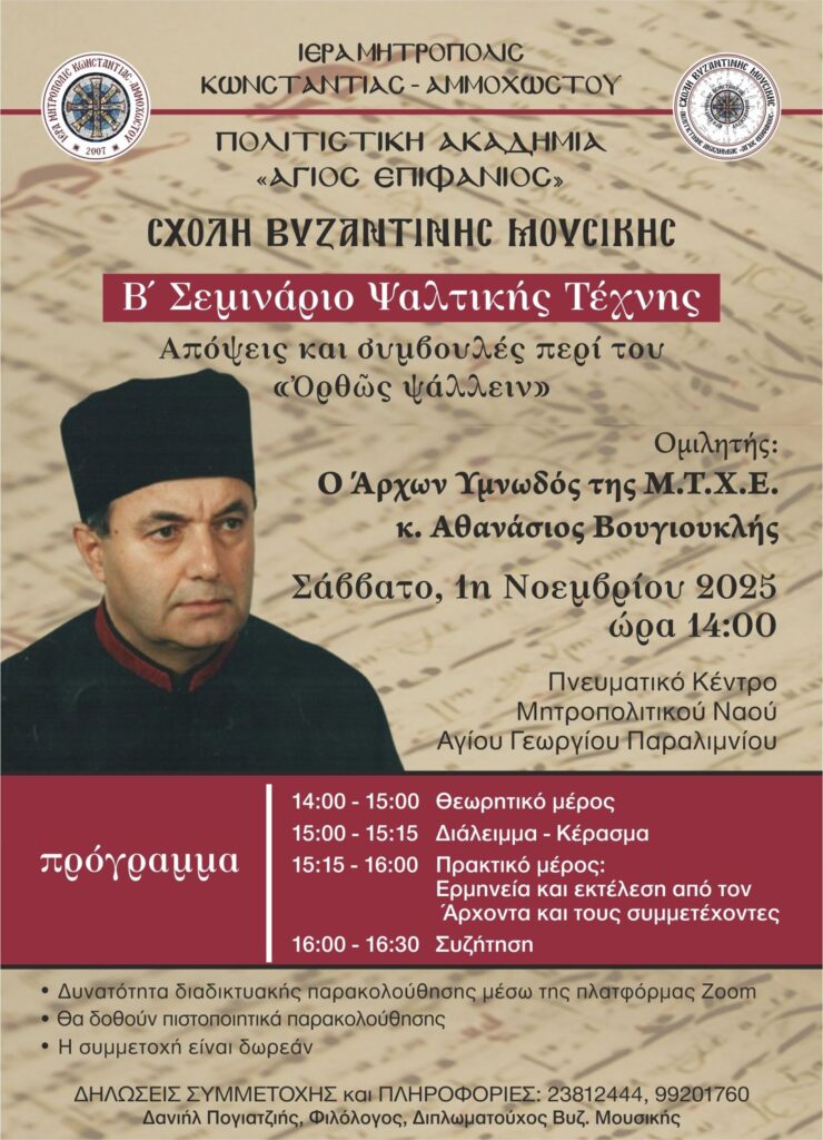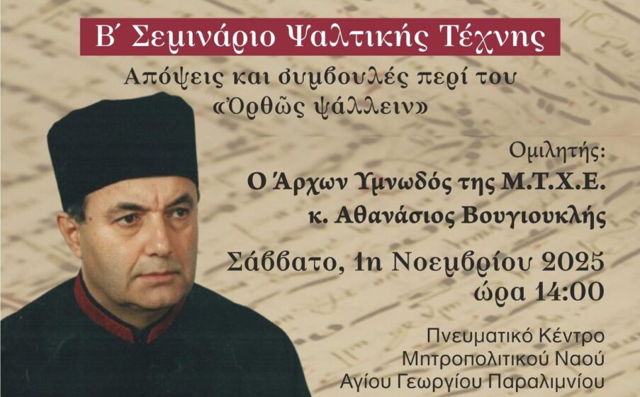Με μεγάλη χαρά, η Σχολή Βυζαντινής Μουσικής της Ιεράς μας Μητροπόλεως, σας προσκαλεί στο Β’ Σεμινάριο Ψαλτικής Τέχνης που διοργανώνουμε με θέμα: «Απόψεις και συμβουλές περί του “Ορθώς Ψάλλειν”» το Σάββατο, 1η Νοεμβρίου 2025.