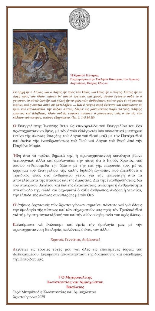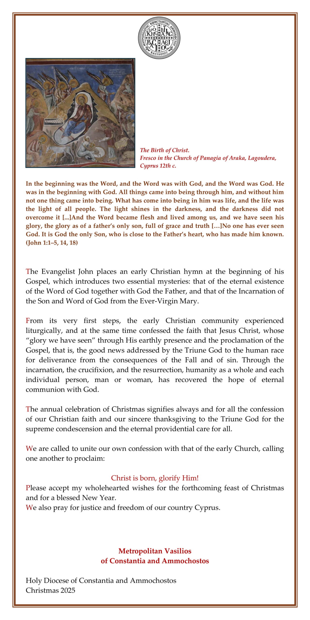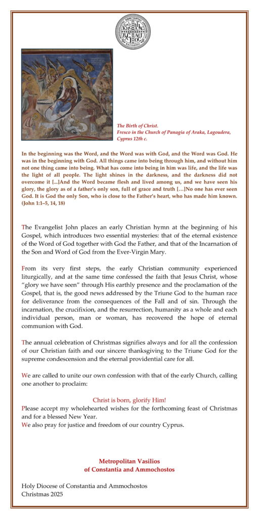 Ευχές Μητροπολίτου Κωνσταντίας και Αμμοχώστου κ. Βασιλείου-ΧρΓεννα 2025 22 Δεκεμβρίου 2025 Άρθρα-Λόγοι Μητροπολίτη, Επικαιρότητα-Ανακοινώσεις Κοινοποίηση άρθρου Facebook Twitter Pinterest Email