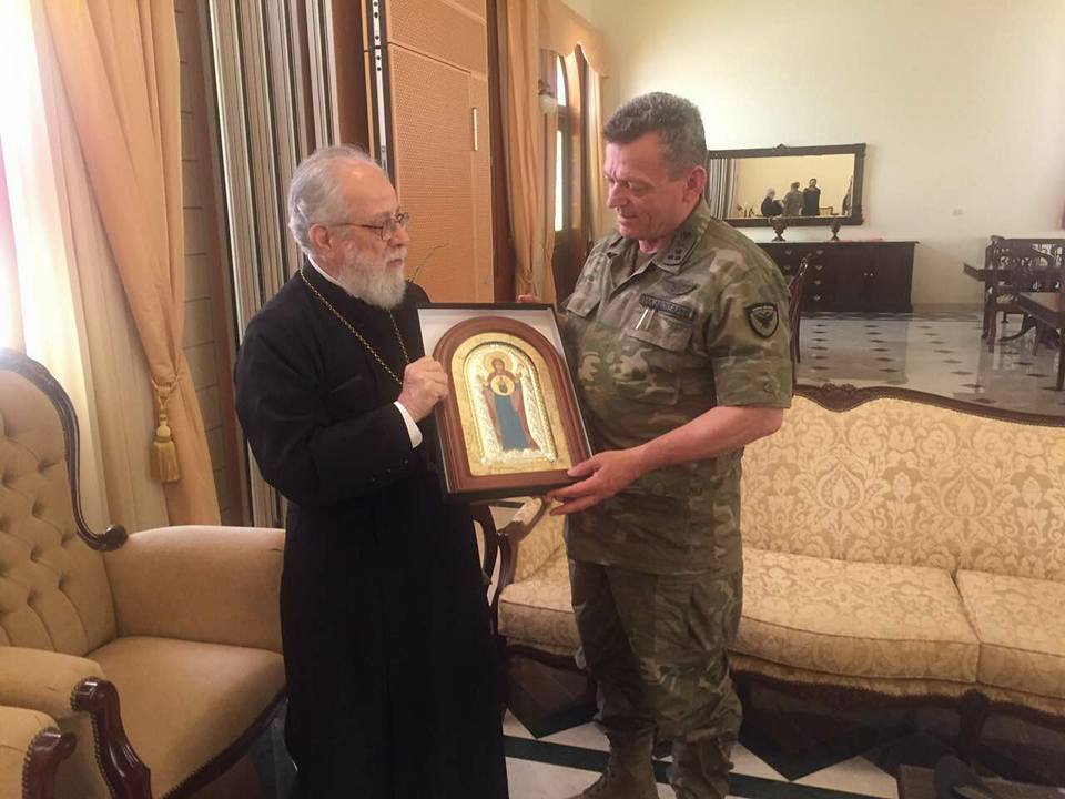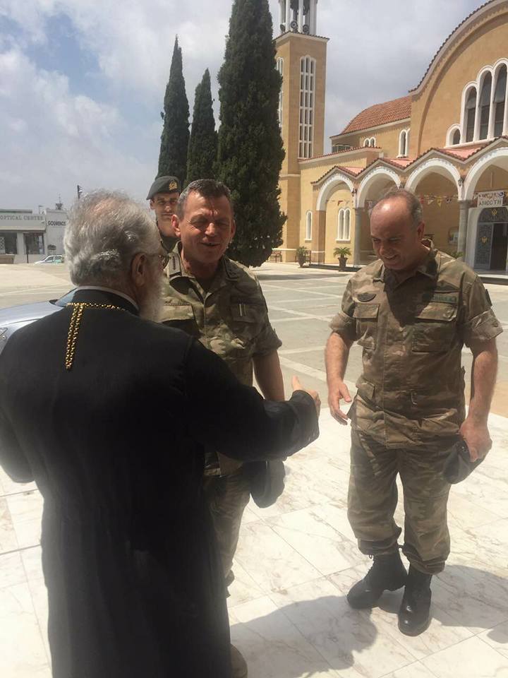 Τον Αρχηγό του ΓΕΕΦ Κύπρου, Αντιστράτηγο Ηλία Λεοντάρη, δέχθηκε το πρωί της Πέμπτης 4 Μαίου 2017 στην Ιερά Μητρόπολη Κωνσταντίας ο Πανιερώτατος Μητροπολίτης μας κ. Βασίλειος. Ο κος Αρχηγός πραγματοποιούσε επίσκεψη στην 7η Ταξιαρχία και τις Μονάδες που βρίσκονται στην ελεύθερη επαρχία Αμμοχώστου. Κατά τη διάρκεια της συνάντησης είχαν την ευκαιρία να συζητήσουν θέματα αμοιβαίου ενδιαφέροντος και συνεργασίας μεταξύ Εκκλησίας και Στρατού, ενώ πραγματοποιήσαν επίσης ανταλλαγή αναμνηστικών δώρων.