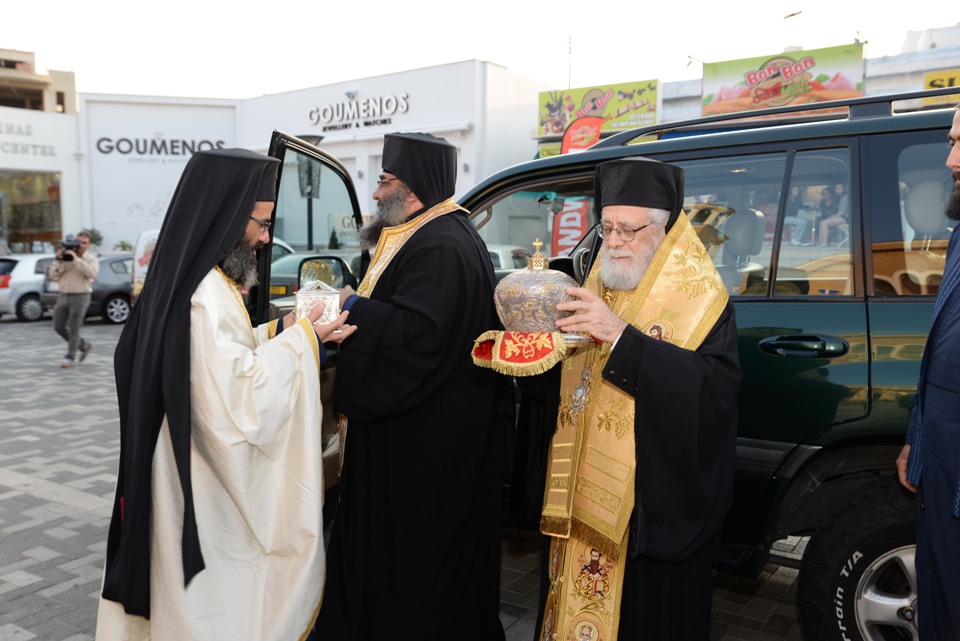Τα ιερά λείψανα τα οποία κόμισε ο έφορος της Μονής και πρωτοσύγκελλος της Ιεράς Μητροπόλεως Κύκκου και Τηλυρίας Αρχιμανδρίτης Αγαθόνικος συνοδευόμενος από τον Ιεροδιάκονο Βλάσιο, υποδέχθηκαν ο επιχώριος Μητροπολίτης κ. Βασίλειος, πλαισιούμενος από κληρικούς και διακόνους της Μητροπόλεως.