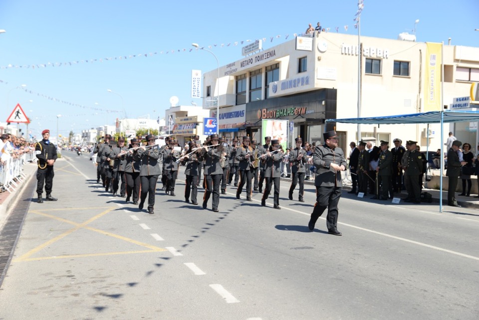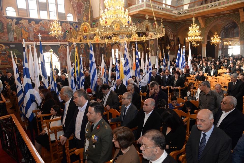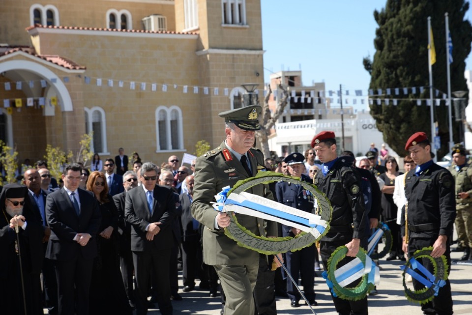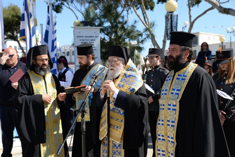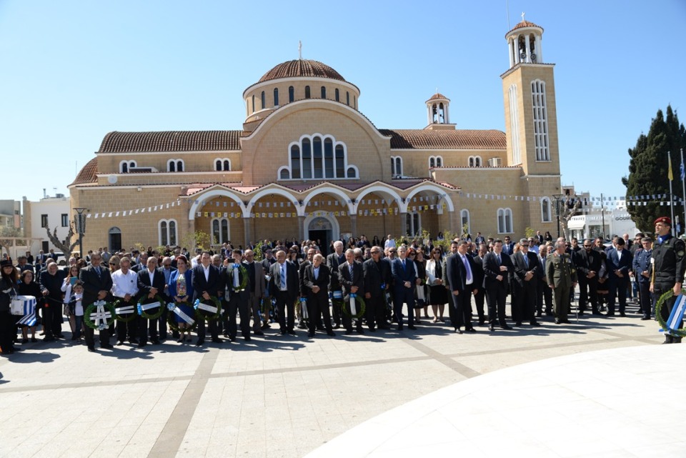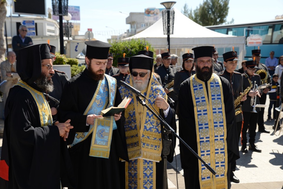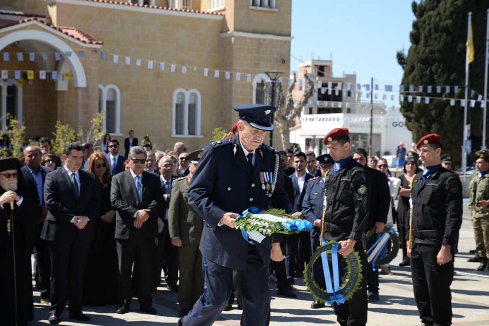 Ακολούθησε τρισάγιο και κατάθεση στεφάνων στο μνημείο πεσόντων στην πλατεία Αγίου Γεωργίου και η καθιερωμένη παρέλαση επί της λεωφόρου 1ης Απριλίου.
