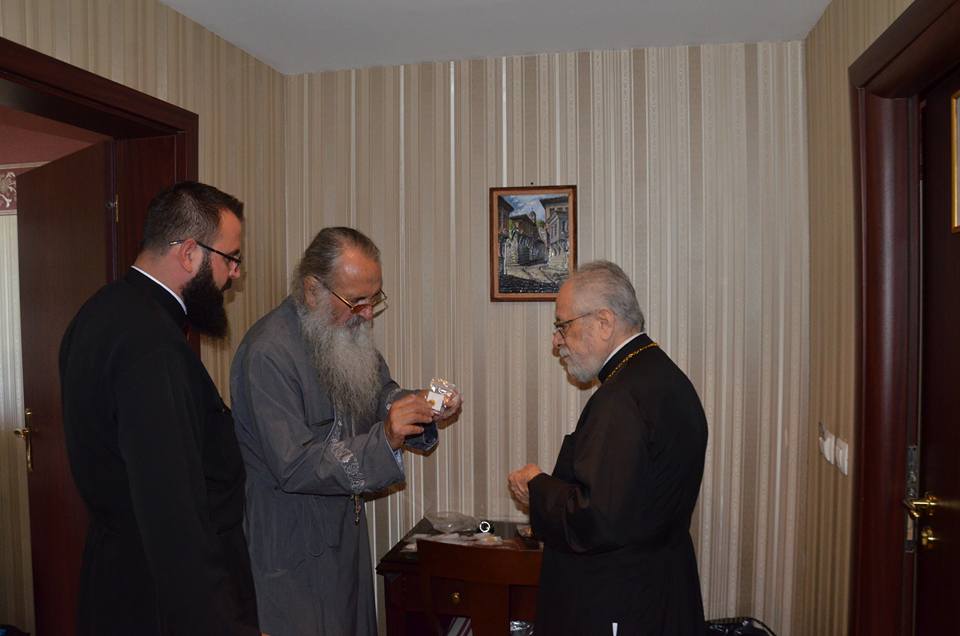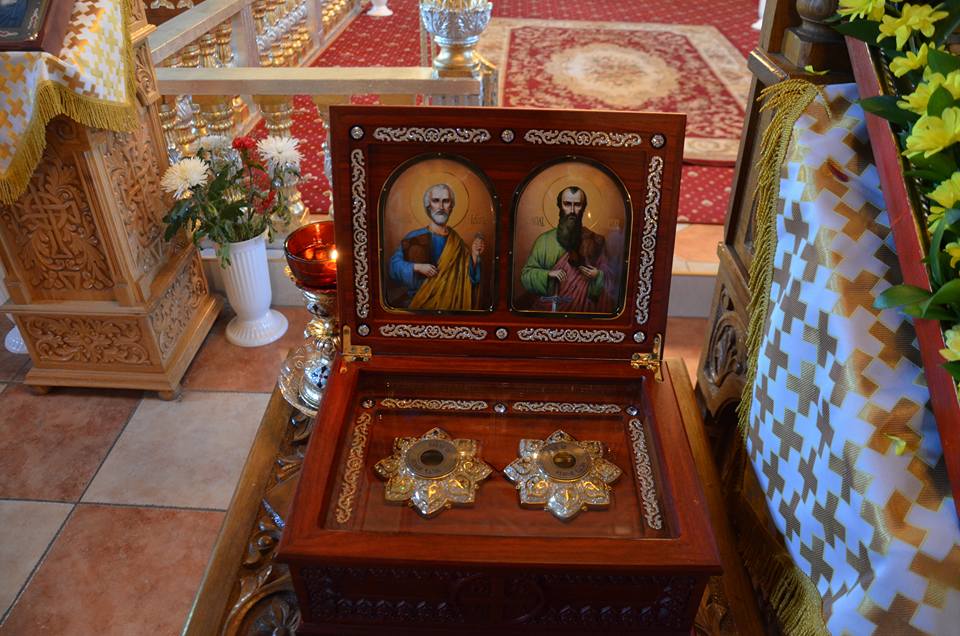 Κατ’ εντολή του Σεβασμιωτάτου κ. Αμβροσίου ο Πρωτοσύγκελλος Πρωτοπρεσβ. Ευάγγελος Ιβάνοφ πρόσφερε στον Μητροπολίτη μας ιερά εικόνα, τεμάχιο ιερών λειψάνων και την ασματική ακολουθία των Αγίων Νεομαρτύρων του Δοροστόλου καθώς επίσης μια αρχιερατική μίτρα και ενα δίσκο που φέρει την ανάγλυφη μορφή των Πρωτοκορυφαίων Αποστόλων Πέτρου και Παύλου, διερμηνεύοντας με αυτό τον τρόπο τα συναισθήματα χαράς και τις ευχαριστίες της τοπικής Εκκλησίας για την παρουσία του στους εορτασμούς.