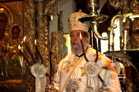 Δεν θα μπορούσα όμως να περατώσω τον λόγο αν δεν αναφερόμουν, πολύ σύντομα, στη σημερινή δεινή θέση της Εκκλησίας της Κύπρου και του πληρώματός της, εξ αιτίας της συνεχιζόμενης για 35 χρόνια επίθεσης και κατοχής, από ένα βάρβαρο στην κυριολεξία, γείτονα κατακτητή.