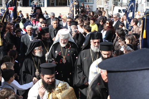 Στη συνέχεια, κλήρος και λαός πορεύθηκαν εν πομπή στον Ιερό Ναό Αγίου Γεωργίου, όπου εψάλλει Πανηγυρική Δοξολογία.