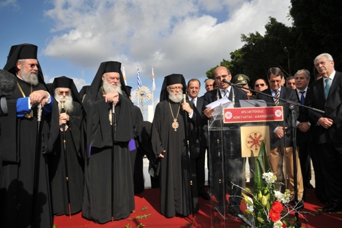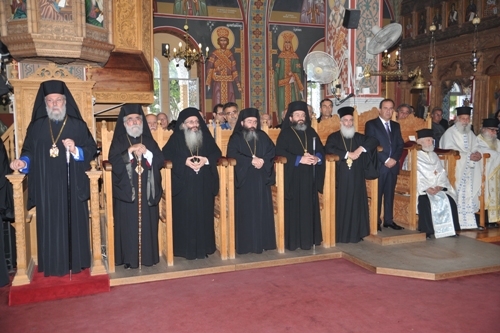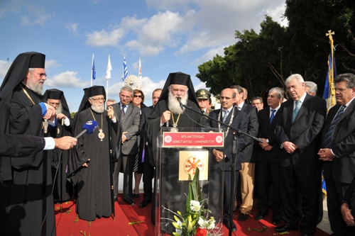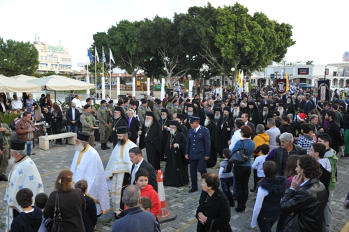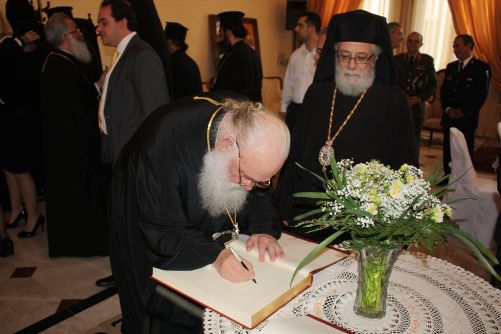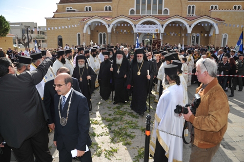 Στη συνέχεια σχηματίστηκε πομπή προς τον Μητροπολιτικό Ναό, όπου εψάλη Δοξολογία και ακολούθησαν η προσφώνηση του Πανιερωτάτου Μητροπολίτη Κωνσταντίας κ. Βασιλείου και η αντιφώνηση του Μακαριωτάτου. Ο Πανιερώτατος προσέφερε στον Μακαριώτατο ένα δίπτυχο με τις εικόνες του Αποστόλου Βαρνάβα και του Αγίου Επιφανίου, προστάτου της Μητροπόλεως. Ο Μακαριώτατος δώρισε στον Πανιερώτατο ένα αρχιερατικό εγκόλπιο και του ευχήθηκε σύντομα να επιστρέψει στη φυσική έδρα της Μητροπόλεώς του, την Αμμόχωστο. Κατόπιν ο Μακαριώτατος δέχθηκε το χαιρετισμό των πιστών εντός του Ναού και ακολούθησε γεύμα στο Μέγα Συνοδικό της Μητροπόλεως.
