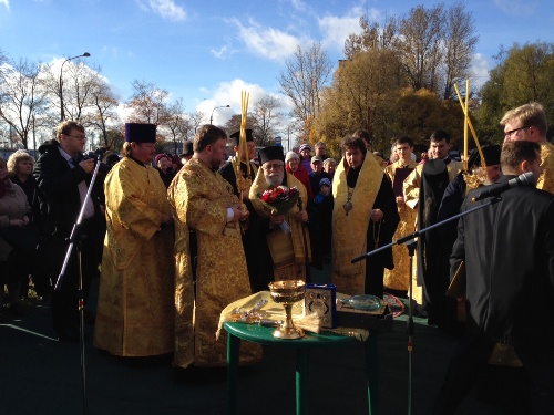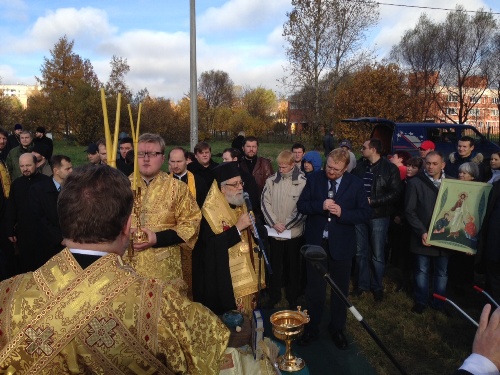 Το πρωί του Σαββάτου 12 Οκτωβρίου ο Μητροπολίτης Κωνσταντίας Βασίλειος τέλεσε την Θεία Λειτουργία στον ιερό ναό του Αγίου Πέτρου Μητροπολίτη Μόσχας, συμπαραστατούμενος από τον Θεοφιλέστατο Επίσκοπο Τσάρκσογιε Σελό Μάρκελλο και κληρικούς της περιοχής. Μετά το τέλος της Θείας Μυσταγωγία ο Πανιερώτατος προσέφερε στον Επίσκοπο Μάρκελλο επιστήθιο εγκόλπιο, το οποίο φέρει την εικόνα του Αγίου Επιφανίου προστάτη της Μητροπόλεως και αντίγραφο της ιερής εικόνας της Παναγίας της Αγίας Νάπας. Αμέσως μετά ο Μητροπολίτης Κωνσταντίας και Αμμοχώστου τέλεσε την ακολουθία του Αγιασμού και τοποθέτησε τον θεμέλιο λίθο στο σημείο όπου θα ανεγερθεί ο ελληνικός ναός των Αγίων Μυροφόρων.