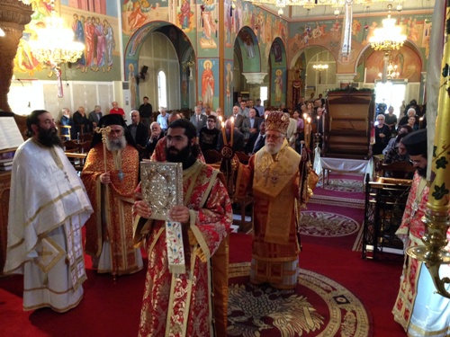 Το Σάββατο, ημέρα της εορτής, τελέστηκε σε πανηγυρικό κλίμα η Αρχιερατική θεία Λειτουργία που προΐστατο ο Μητροπολίτης μας κ. Βασίλειος. Κατά τη διάρκεια της θείας Λειτουργίας ο Πανιερώτατος, σε σύντομο λόγο, εξήρε το μαρτυρικό τέλος του Αγίου που μαζί με πολυάριθμα άλλα της τότε περιόδου οδήγησαν περίπου δέκα χρόνια μετά στο διάταγμα της ανεξιθρησκείας των Μεδιολάνων (313 μ.Χ.):, που έφερε το τέλος των διωγμών και την επίσημη εδραίωση του χριστιανισμού. Το απόγευμα της εορτής τελέστηκε Παράκληση και ακολούθησε σύντομο θεατρικό δρώμενο από παιδιά του κατηχητικού της ενορίας με τη ζωή και το μαρτύριο του Αγίου.