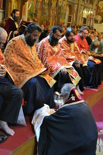 Στον ειδικά διαμορφωμένο σολέα του ναού ο Πανιερώτατος Μητροπολίτης Κωνσταντίας και Αμμοχώστου κ. Βασίλειος μέσα στα πλαίσια μίας σεμνής, ταπεινής, συμβολικής και άκρως διδακτικής τελετής, έπλυνε τα πόδια 12 Ιερέων, μιμούμενος τον Κύριο ημών Ιησού Χριστό, ο οποίος πριν από το Μυστικό Δείπνο ένιψε τα πόδια των μαθητών Του.