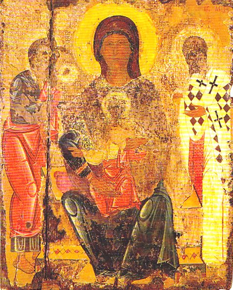 Από τον 13ο αιώνα, έχουμε μια μοναδική εικόνα από την εκκλησία της Παναγίας Αγγελόκτιστης. Στη εικόνα αυτή έχουν γίνει επιζωγραφίσεις του 17ου αιώνα, χωρίς όμως να επηρεαστεί το αρχικό θέμα της εικόνας. Σ΄αυτή εικονίζεται η Παναγία Ένθρονη Βρεφοκρατούσα, μεταξύ του Ευαγγελιστή Λουκά αριστερά και του Αγίου Λαζάρου δεξιά [φωτ. δίπλα]. Η συγκεκριμένη εικόνα έχει συμβολικό χαρακτήρα, αφού ανήκει σε μια περίοδο δραματικών ανατροπών στο χώρο της εκκλησίας, όπου, με την Κυπριακή Βούλα του 1260 που εξέδωσε ο Πάπας, καταργούνταν δέκα από τις δεκατέσσερις ορθόδοξες επισκοπικές έδρες, ανάμεσα στις οποίες και η Επισκοπή Κιτίου, η οποία βρέθηκε κάτω από τη δικαιοδοσία της Λατινικής Αρχιεπισκοπής Λευκωσίας. Η απεικόνιση του Αγίου Λαζάρου, πρώτου Επισκόπου Κιτίου δίπλα στην Παναγία, υπογραμμίζει τη σημασία που είχε για τον ορθόδοξο λαό η Επισκοπή Κιτίου στα δύσκολα χρόνια της Λατινοκρατίας.