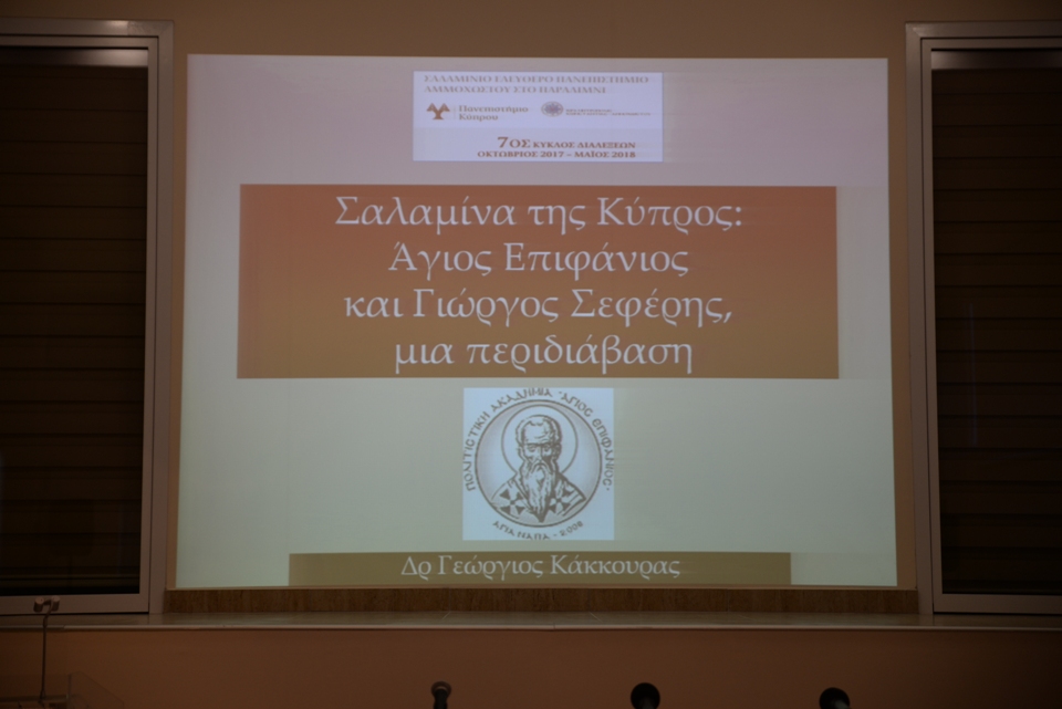 Η τελευταία διάλεξη είχε ως τίτλο «Σαλαμίνα της Κύπρος: Άγιος Επιφάνιος και Γιώργος Σεφέρης. μια περιδιάβαση», με εισηγητές τους κ. Γιώργο Γεωργή, Καθηγητή στο Πανεπιστήμιο Νεάπολις της Πάφου και τον Δρ Γεώργιο Κάκκουρα, Επιθεωρητή Θρησκευτικών Μέσης Εκπαίδευσης. Την διάλεξη συντόνισε ο δημοσιογράφος Πάρης Ποταμίτης.