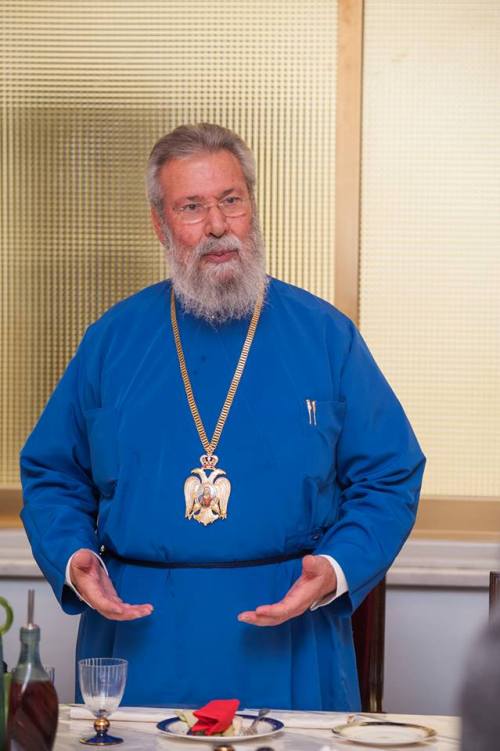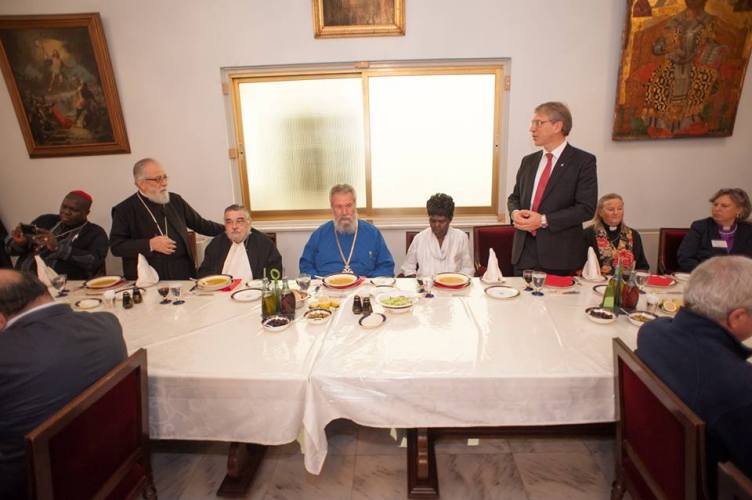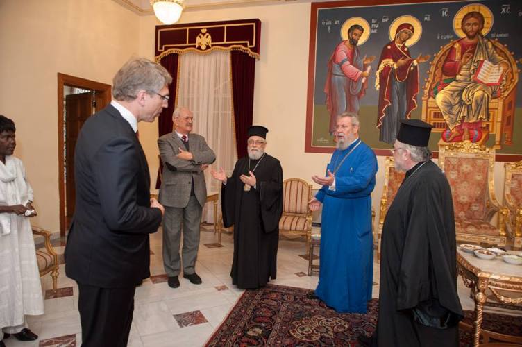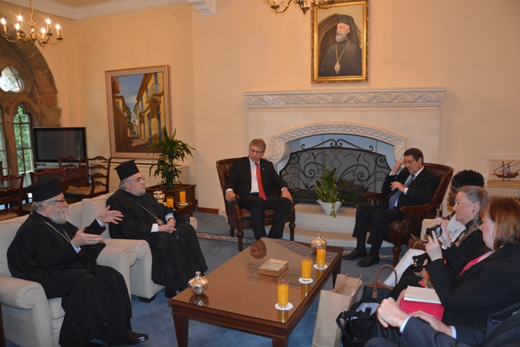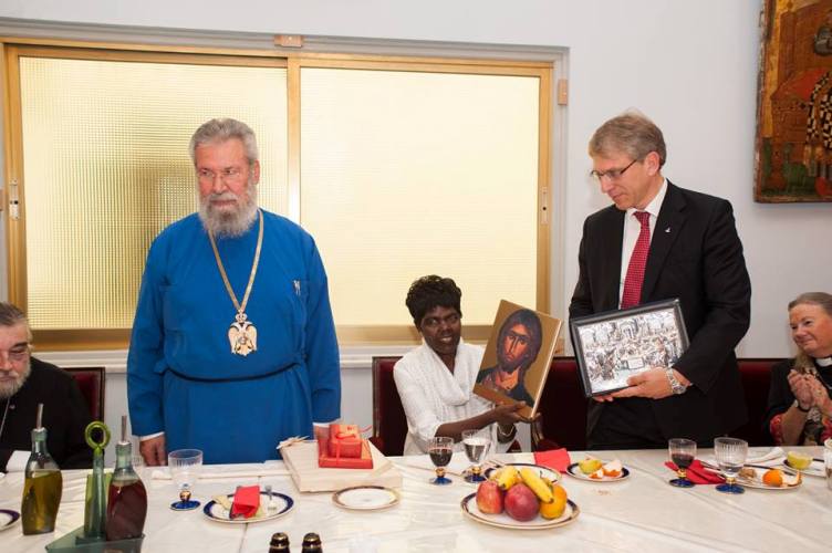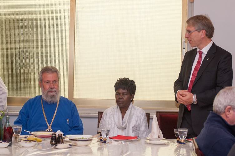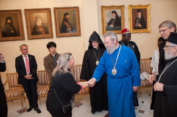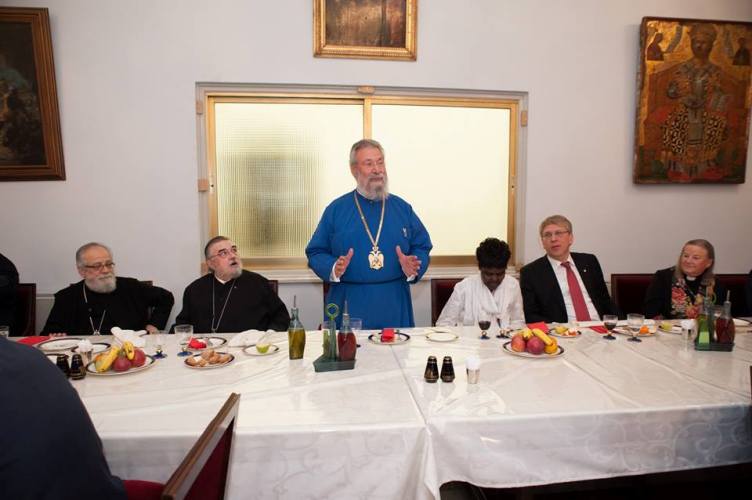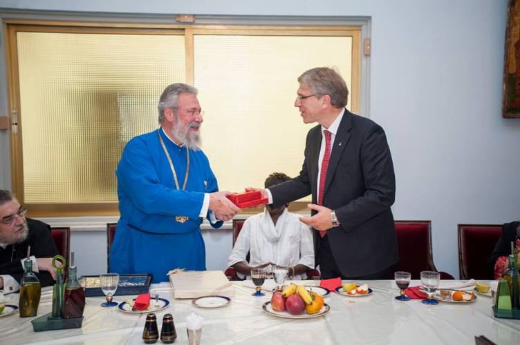 Λίγο μετά το μεσημέρι, η Εκτελεστική Επιτροπή του Π.Σ.Ε, πέρασε το κατώφλι της Ιεράς Αρχιεπισκοπής, όπου στο Μέγα Συνοδικό τους υποδέχθηκε ο Μακαριώτατος Αρχιεπίσκοπος Κύπρου κ. Χρυσόστομος. Μετά από το καλωσόρισμα και σύντομη αναφορά στην ιστορία της Κυπριακής Εκκλησίας ακολούθησε γεύμα προς τιμήν των υψηλών επισκεπτών και έγινε ανταλλαγή δώρων.