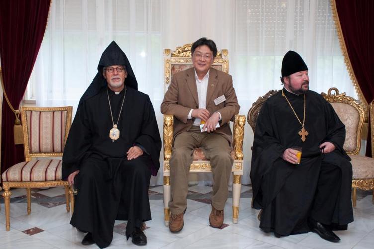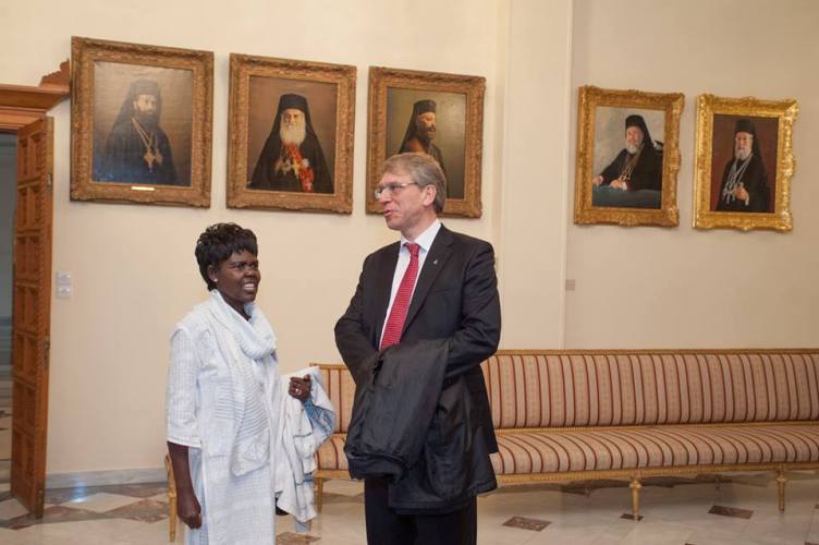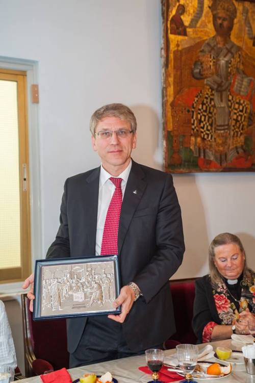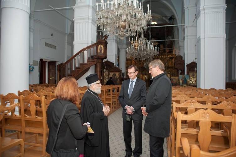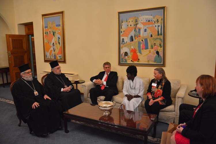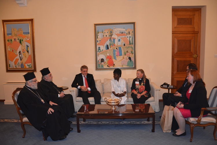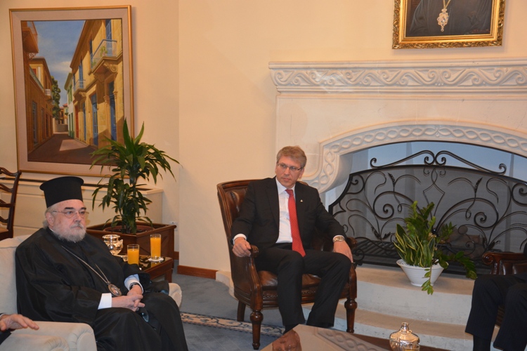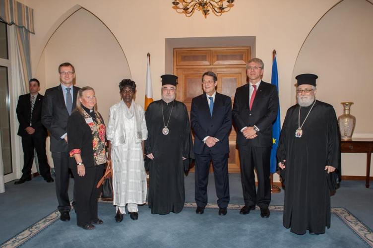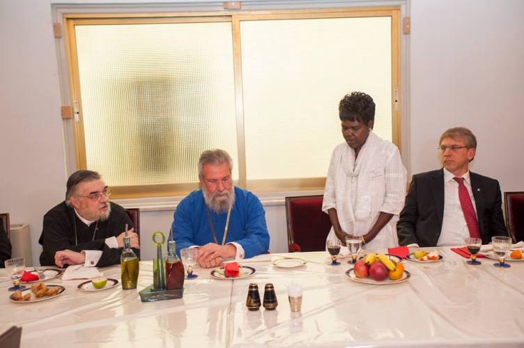 Λίγο μετά το μεσημέρι, η Εκτελεστική Επιτροπή του Π.Σ.Ε, πέρασε το κατώφλι της Ιεράς Αρχιεπισκοπής, όπου στο Μέγα Συνοδικό τους υποδέχθηκε ο Μακαριώτατος Αρχιεπίσκοπος Κύπρου κ. Χρυσόστομος. Μετά από το καλωσόρισμα και σύντομη αναφορά στην ιστορία της Κυπριακής Εκκλησίας ακολούθησε γεύμα προς τιμήν των υψηλών επισκεπτών και έγινε ανταλλαγή δώρων.