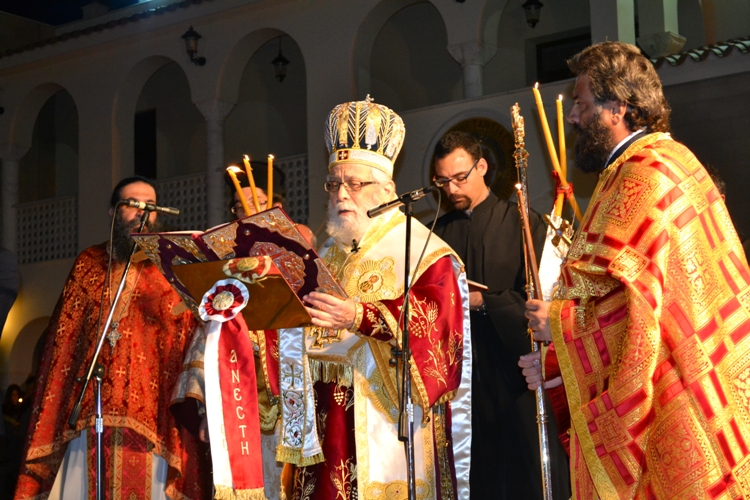 Ο Πανιερώτατος ανέγνωσε το Ιερό Ευαγγέλιο και κάτω από τους ήχους των χαρμόσυνων κωδωνοκρουσιών ανήγγειλε σε όλους το «Χριστός Ανέστη», με την καθιερωμένη τάξη, ευχόμενος η Αναστάσιμος χαρά να πλημμυρίζει την καρδιά όλων των ανθρώπων με αγάπη και ελπίδα. Στη συνέχεια τέλεσε την πανηγυρική Θεία Λειτουργία της Αναστάσεως.
