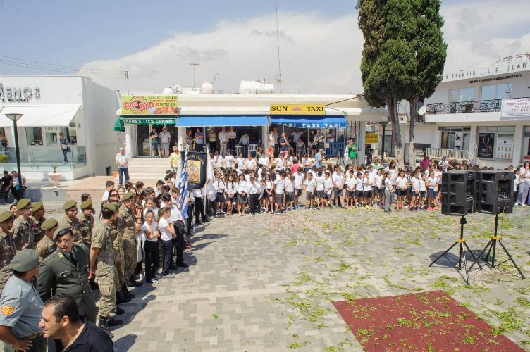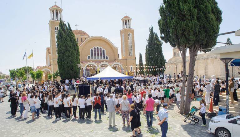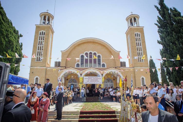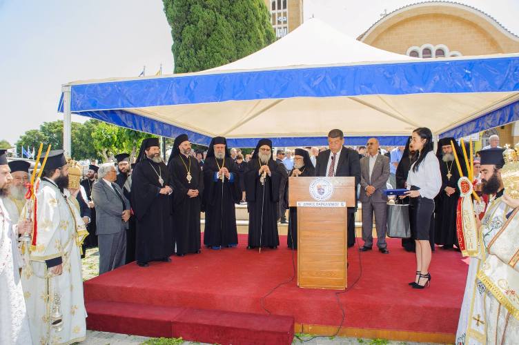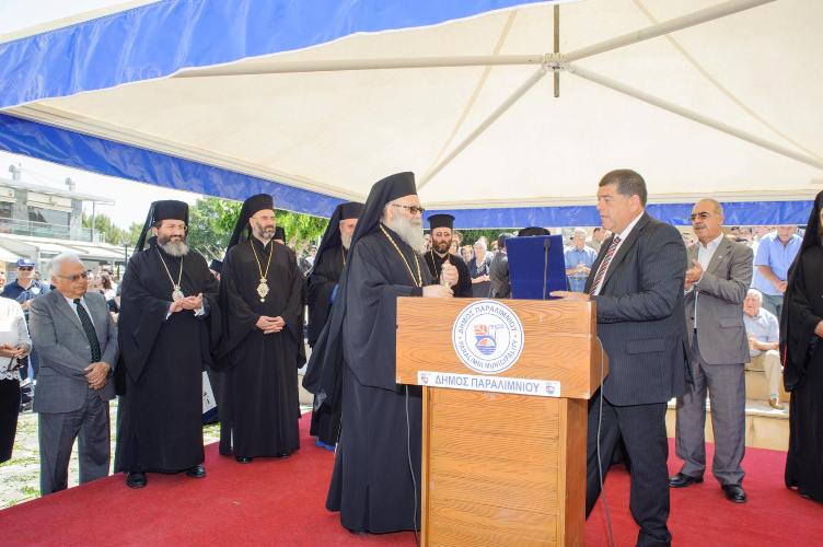 Τον Μακαριώτατο και την τίμια συνοδεία του, υποδέχθηκαν μπροστά από τον Μητροπολιτικό ναό Αγίου Γεωργίου ο Πανιερώτατος Μητροπολίτης Κωνσταντίας και Αμμοχώστου κ. Βασίλειος πλαισιούμενος από τον ιερό κλήρο, τον Δήμαρχο Παραλιμνίου κ. Θεόδωρο Πυρίλλη, τους Δημάρχους και κοινοτάρχες ομόρων Δήμων και κοινοτήτων, εκπρόσωπο του Δημάρχου Αμμοχώστου, Βουλευτές της επαρχίας, εκπροσώπους του Στρατού και της Αστυνομίας, οργανωμένα σύνολα, την μαθητιώσα νεολαία και πλήθος πιστών.