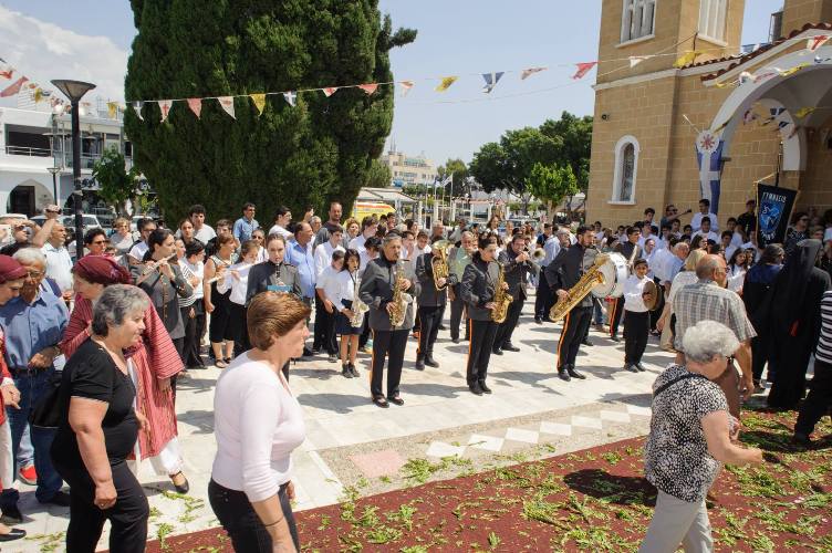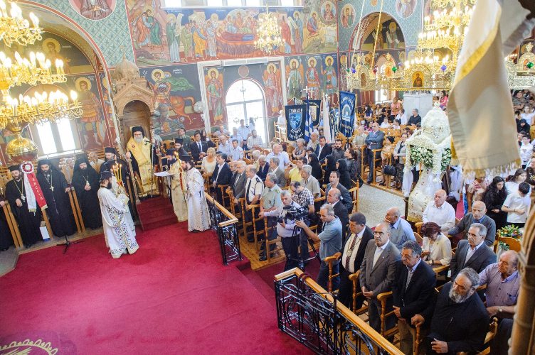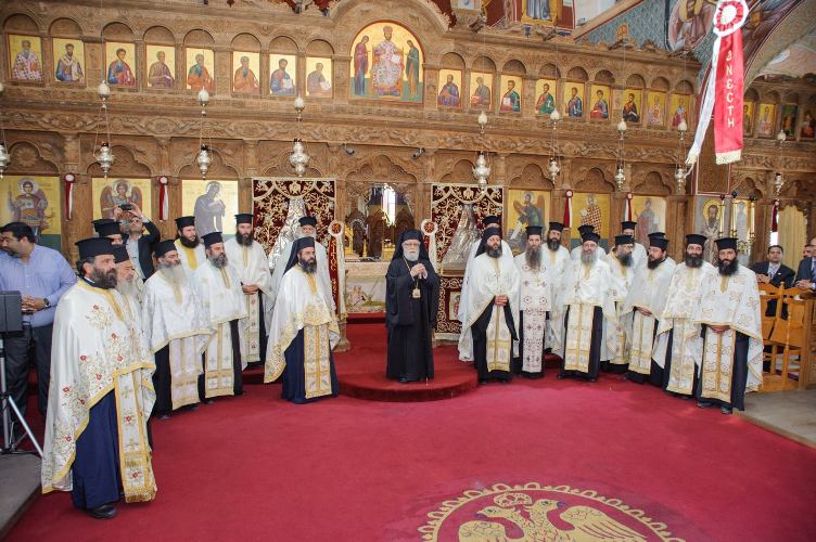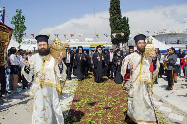 Ακολούθως σχηματίστηκε πομπή προς τον ναό, όπου εψάλλη Πανηγυρική Δοξολογία. Στη συνέχεια ο Πανιερώτατος Μητροπολίτης Κωνσταντίας-Αμμοχώστου κ. Βασίλειος προσφώνησε τον προκαθήμενο του Παλαιφάτου Πατριαρχείου Αντιοχείας. «Σας καλωσορίζουμε Μακαριώτατε στην Ιερά Μητρόπολη Κωνσταντίας και Αμμοχώστου, μια μητροπολιτική περιφέρεια της οποίας το μεγαλύτερος μέρος της βρίσκεται υπό κατοχή». «Η ευλογημένη έλευση σας σήμερα Μακαριώτατε, αποτελεί διπλή χαρά για εμάς γιατί συμπίπτει με την παρουσία αυτές τις ημέρες εδώ στον Μητροπολιτικό μας ναό του Αγίου Γεωργίου της ιεράς εικόνας της Παναγίας Σουμελά, η οποία βίωσε κι αυτή τον πόνο της προσφυγιάς μετά την φυγή της από την ιστορική μονή της Παναγίας στην Τραπεζούντα του Πόντου, καθώς επίσης και της παρουσίας της τιμίας κάρας του πολιούχου μας και πρώτου Επισκόπου Κωνσταντίας Αγίου Επιφανίου, του μεγάλου αυτού ανδρός ο οποίος με την συμβολή του στην Γ’ Οικουμενική Σύνοδο, εδραίωσε το αυτοκέφαλο της Εκκλησίας Κύπρου» και του οποίου την μνήμη εορτάσαμε χθες.
